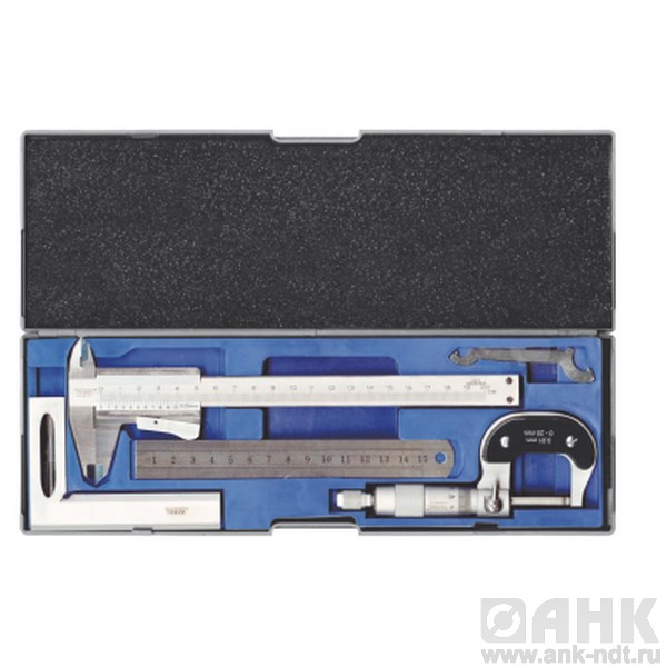 Описание набора из штангенциркуля, микрометра, линейки и угольника
