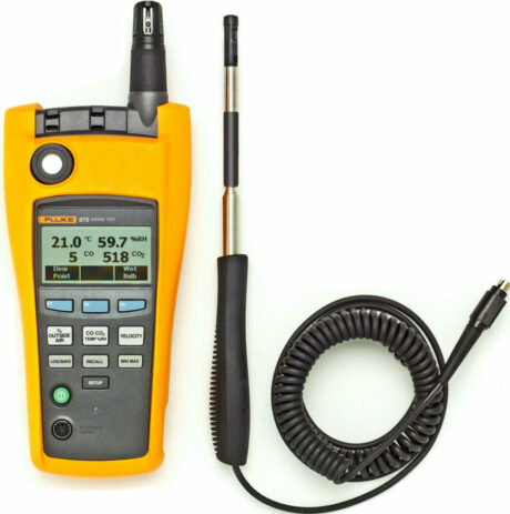 - Fluke 975 позволяет одновременно измерить и зарегистрировать температуру, влажность, содержание CO2 и CO с отображением измеренных значений на ярком ЖК дисплее с подсветкой;
